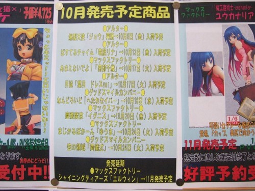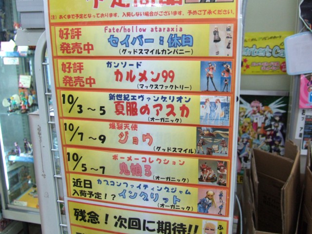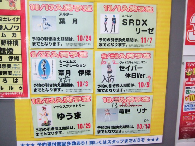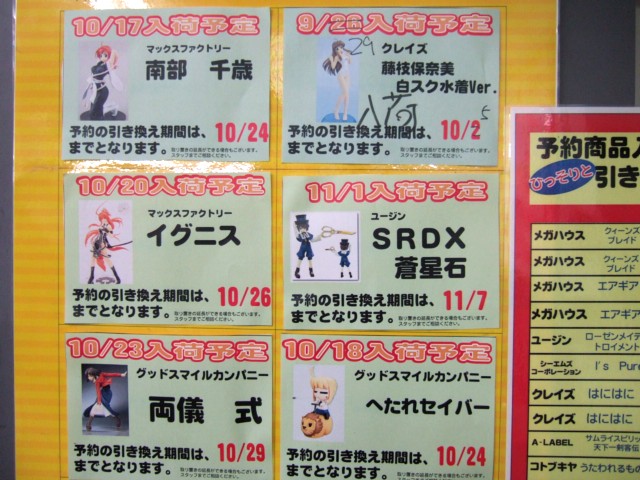 9月29日に、グッスマ公式の総合インフォメーションでも伝えられているように、10月のグッスマ取扱商品の入荷予定日が確定したようで、コトブキヤラジオ会館では、珍しく文字情報のみの、入荷予定日POPの掲示を開始していました、ほか、ソフマップやキャラシティの入荷予定表も変更されていたので、その辺のアキバでの入荷予定日をまとめてみました。画像は+アルファ部分。