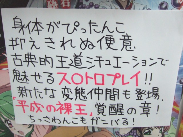 殴り書きPOPによれば、『身体がぴったんこ 抑えきれぬ便意 古典的王道シチュエーションで魅せるス○トロプレイ!! 新たな変態仲間も登場、「平成の裸王」覚醒の章!ちっさわんこもガンバる!』という内容みたい・・・w
