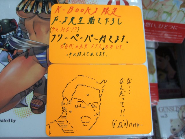 9月28日にはアキバで発売されていた、エロイラスト集対戦型ビジュアルブックのクイーンズブレイド第4弾「近衛隊長 エリナ 」(AA)と「古代の王女 メナス」(AA)ですが、「もう職業とかどうでもいいな、エロければ。」というPOPがあったK-BOOKSに、AA(アスキーアート)風のキバヤシっぽい人のPOPが追加されていることに気がつきました。