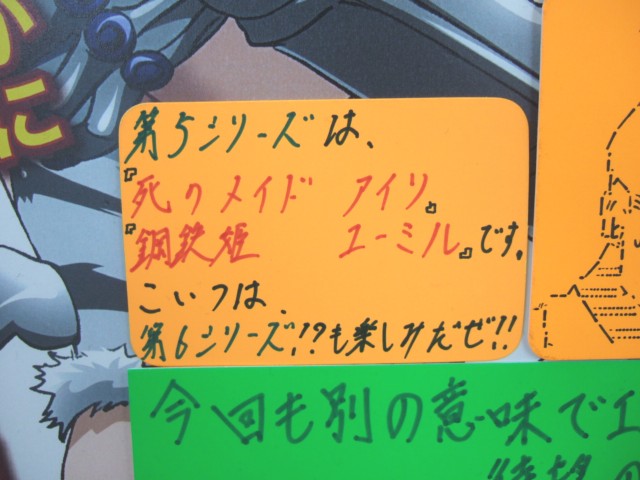 そのPOPのAA(アスキーアート)風のキバヤシっぽい人によると、「我々は騙されていた・・・・・(?) 第5シリーズは「メイド」と「ロリータ」・・・・・ 第4シリーズでの『妹』は今後の萌えの布石にすぎなかったんだよ!」とのこと。(POP拡大)