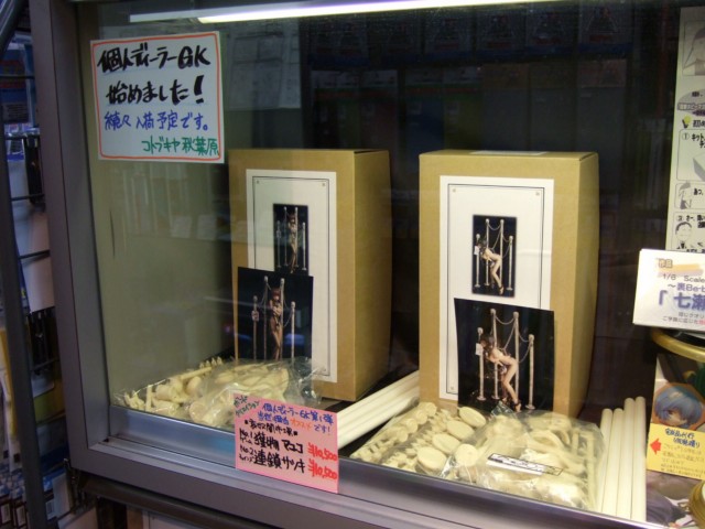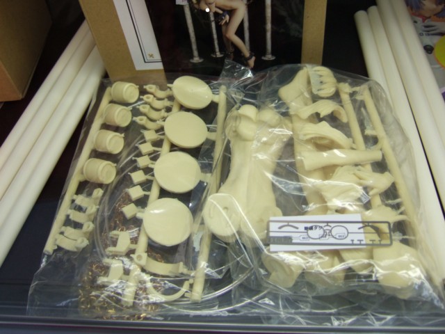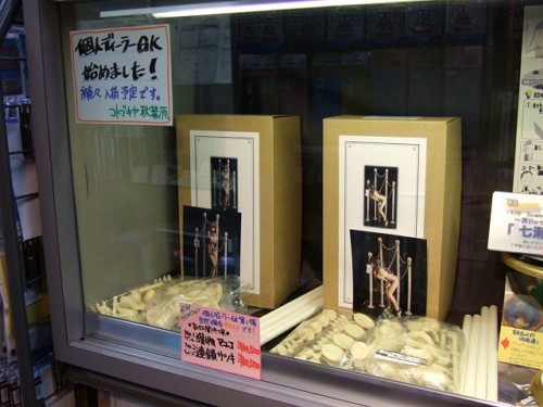 コトブキヤ秋葉原店にて、「個人ディーラーGKはじめました!」として、10月4日ころから、個人ディーラーのガレージキット(GK)の取り扱いを開始していました。個人ディーラーGK第1弾とされていたのはボンドクリエイションさんの哀奴闇市場「NO.1ゲーム 獲物 マユコ」と「NO.2チェインズ 連鎖 サツキ」の2種。どちらも鎖につながれた、裸の女の子の大きなお友達専用ガレキ。