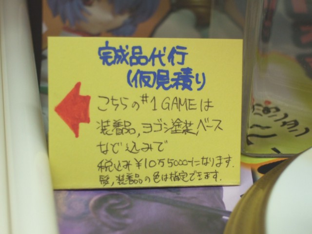 ちなみに「NO.1ゲーム 獲物 マユコ」には、コトブキヤで受け付けている「製作代行サービス」の見積もり金額も記載されていて、そのPOPによると、装着品、汚し塗装、ベース代コミで105,000円みたい。