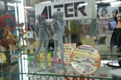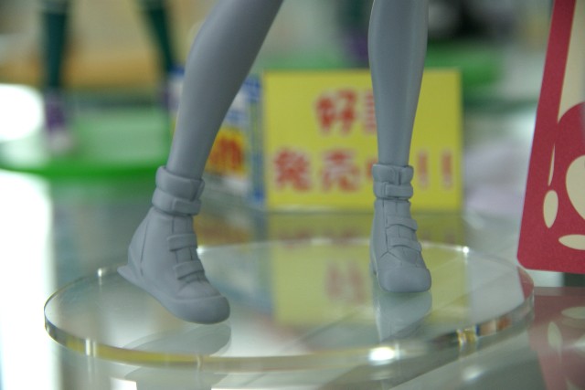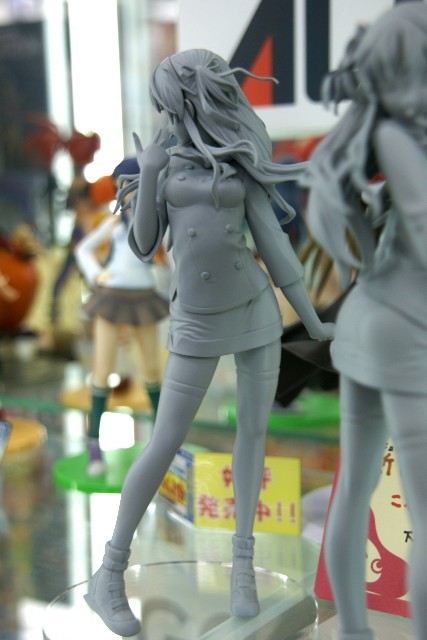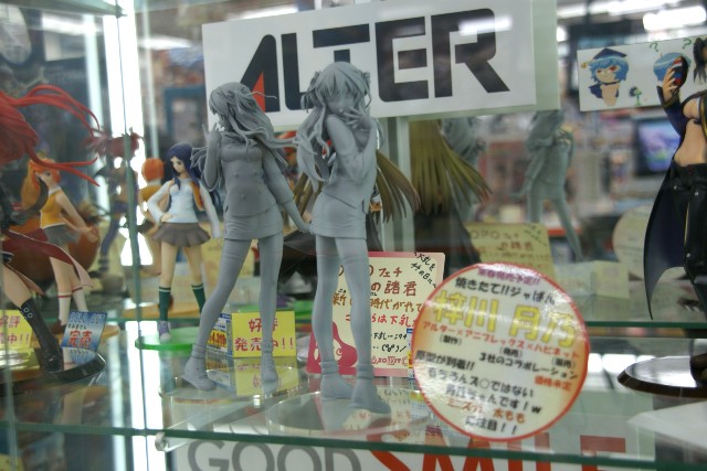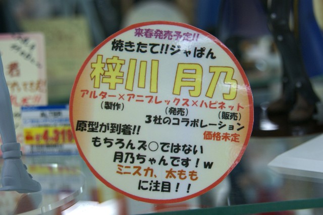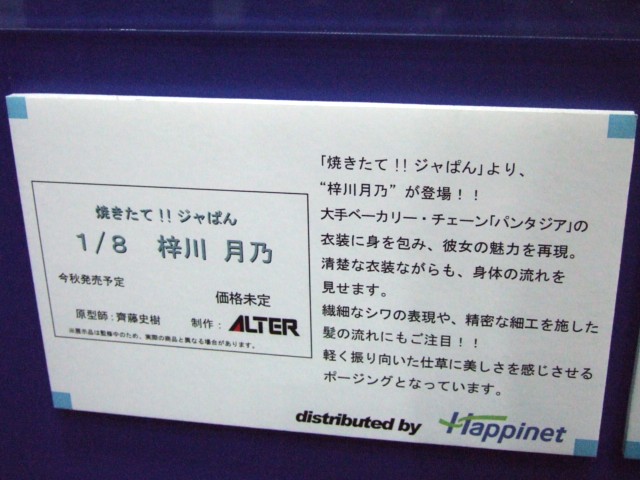 10月6日、キャラシティにて、ワンフェス2006夏ハピネットブースでもサンプルが展示されていた、アルター製作、アニプレックス発売、ハピネット販売の3社コラボレーションフィギュアとなる、「焼きたて!!ジャぱん 梓川月乃」の無彩色サンプルが、前と後ろを向く形で2体、展示開始していました。つけられていたPOPによると、「ミニスカ、フトモモに注目!!」というものでみたいです。