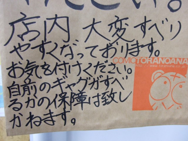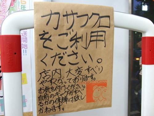 もちろん各店ともに傘袋を置いていたわけですが、とらのあな本店では、1回入り口の防犯ゲートに、包み袋を使用した簡易POPがつけられて、そこには「カサフクロをご利用ください。店内、大変すべりやすくなっております。お気をつけください。自前のギャグがすべるかの保障は致しかねます。」と書かれていましたw