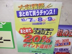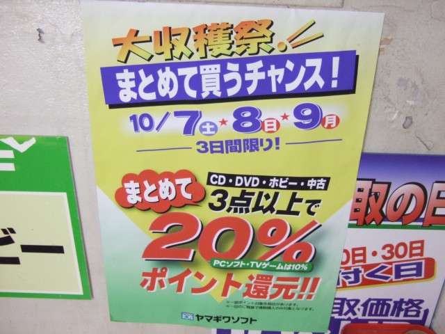 ヤマギワソフトアニメ館では、10月7〜9日まで、CD、DVD、ホビー、中古を、まとめて3点購入で20%ポイント還元のセールを行うみたいです。