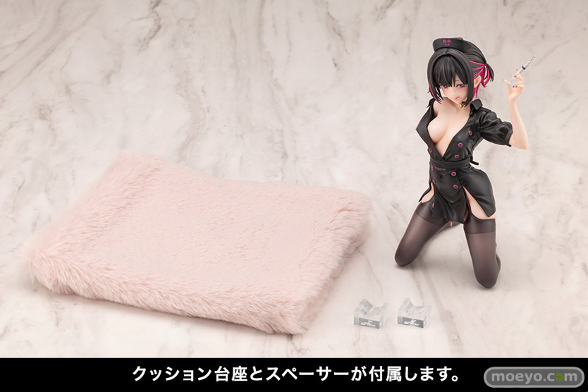 ナース衣装の質感や髪の毛の造形、セクシーなボディラインも1つ1つ丁寧にこだわって造形いたしました。専用のクッション台座も付属いたします。また、クッションに本体を置く際に安定するよう、