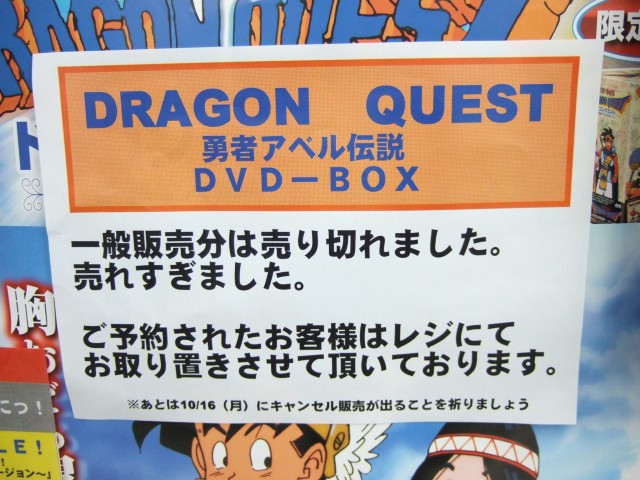 ■ 先日発売をお伝えした、「ドラゴンクエスト~勇者アベル伝説~ コンプリートDVD-BOX(限定生産)」(AA)ですが、11日にはキャラシティでは完売となり、POPでは「売り切れました、売れすぎました。」とされていました。すごい人気w