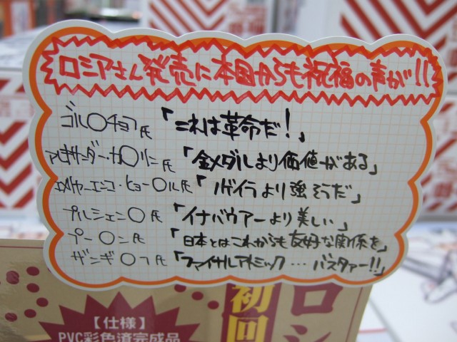 また、POPによると、ロシアさん発売に、本国からも、エメリヤーエンコ・ヒョー○ル氏「ノゲイラより強そうだ」 プルシェン○氏「イナバウアーより美しい」 ザンギ○フ氏「ファイナルアトミック・・・バスタァー!」などの祝福の声が届いていたみたいです。