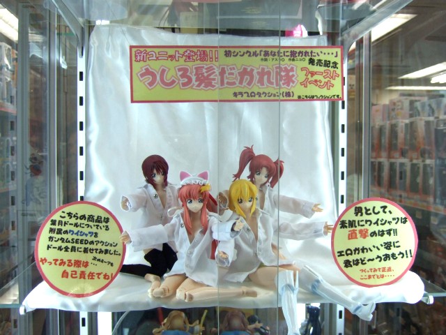 展示の上部にはPOPが吊るされていて、それによるとどうやらキラプロダクション所属の「うしろ髪だかれ隊」という新ユニットらしく、初シングル「あなたに抱かれたい・・・」発売記念ファーストイベントの様子みたい。