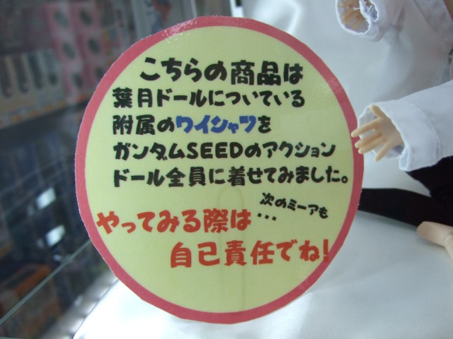 キャラシティ5Fでは、メガハウスのアクションフィギュアの「ルナマリア」(AA)(参考レビュー)、「ラクス」(AA)(参考レビュー)、「メイリン」(AA)(参考レビュー)、「ステラ」(AA)4種に、「葉月」(AA)付属のワイシャツを着せた展示が開始しています。POPによると「男として、素肌にワイシャツは直撃のはず!! エロかわいい姿に君はど〜う思う!! 作ってみて正直、ここまでとは・・・」とのこと。