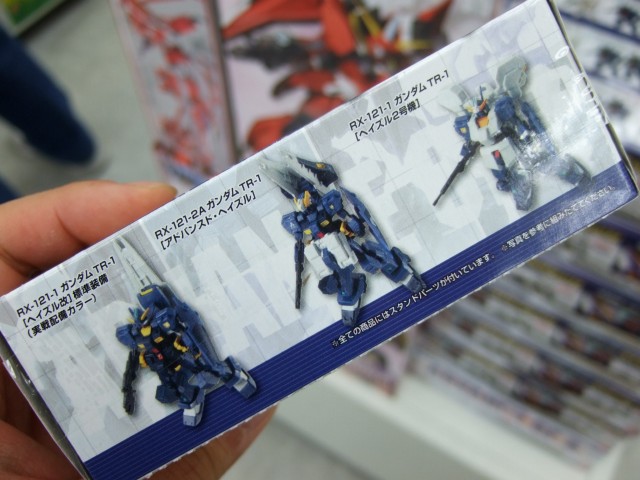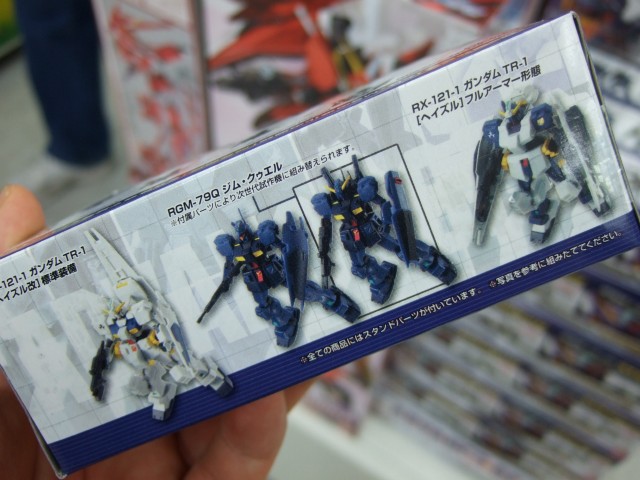 大きさは90mm〜で、ジム・クウェル、ガンダムTR-1「ヘイズル改」標準装備(試作機カラー/実戦配備カラー)、ガンダムTR-1「ヘイズル」フルアーマー形態、ガンダムTR-1「ヘイズル2号機」、ガンダムTR-1「アドバンスドヘイズル」の全6種で、1BOX8個入り 。パーツ組み換えで、色々遊べるみたいです。