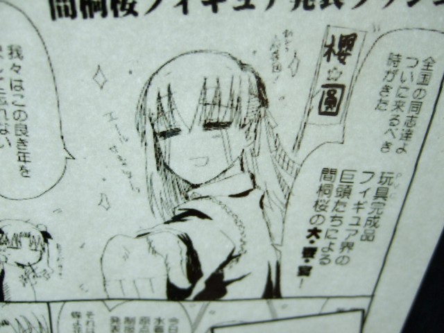 10月26日に発売予定の、西脇だっと氏著のマンガ「Fate/stay night 2巻」(AA)ですが、とらのあな1号店では「特製小冊子プレゼント」の告知があり、その小冊子の内容サンプルも掲示されていました。それによると「祝!漫画版Fate発売間桐桜フィギュア発売ラッシュ」とされていて、「フィギュア会の巨頭たちによる間桐桜の大・饗・宴!」と、桜が泣いて喜んでいましたw