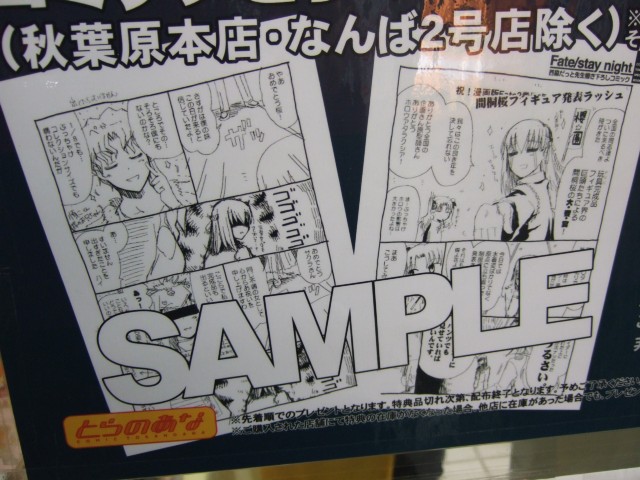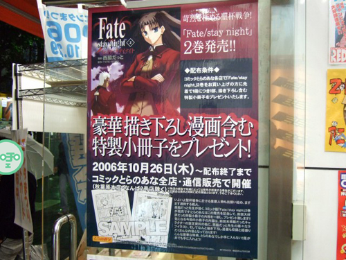 10月26日に発売予定の、西脇だっと氏著のマンガ「Fate/stay night 2巻」(AA)ですが、とらのあな1号店では「特製小冊子プレゼント」の告知があり、その小冊子の内容サンプルも掲示されていました。