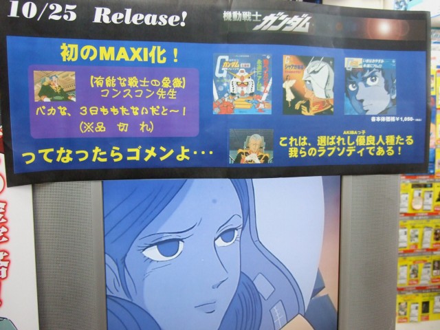 ゲームシティでは、「シャアが来る」(AA)、「いまはおやすみ」(AA)、「翔べ!ガンダム」(AA)の、ガンダム主題歌復刻MAXICDシングル3種が、「機動戦士ガンダム I 特別版【劇場版】」(AA)、「機動戦士ガンダム II 哀・戦士編 / 特別版【劇場版】」(AA)、「機動戦士ガンダム III めぐりあい宇宙編 / 特別版 【劇場版】」(AA)のDVDとともに並べられて発売されていました。
