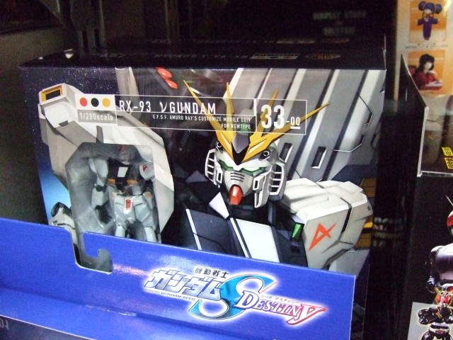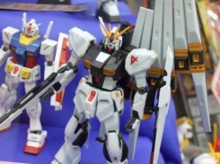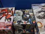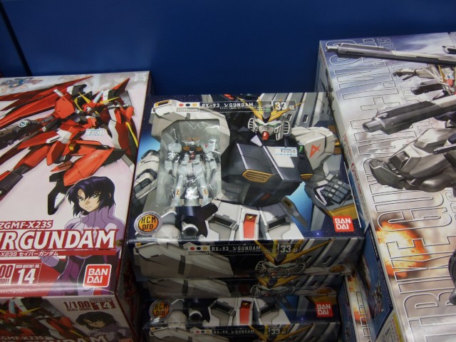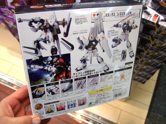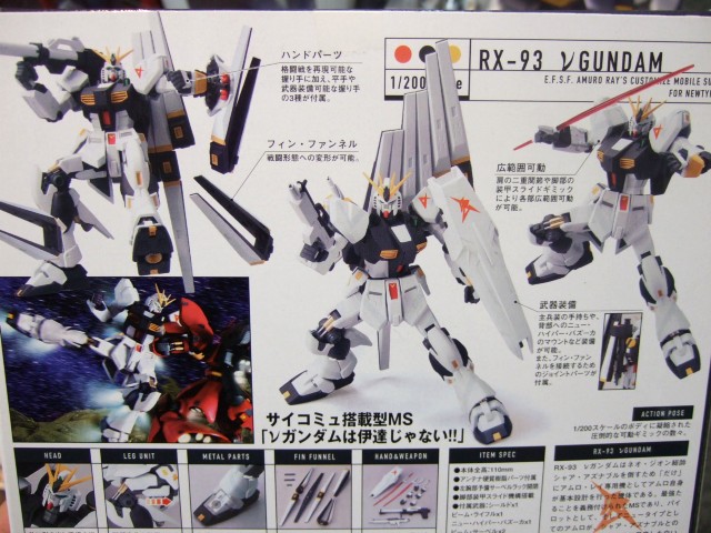 これは、劇場版ガンダム「機動戦士ガンダム 逆襲のシャア – Wikipedia」でアムロが登場した、「νガンダム」を立体化したもので、掲示されていたPOPによると、「首の引き出し機構を搭載し、飛行シーンの再現を演出」「脚リア部の装甲がスライドし、膝関節の可動範囲が大幅に拡大」「内部に金属パーツを使用し、機体の安定性と重量感をアップ」「フィン・ファンネルはココに脱着、戦闘形態への変更が可能」「主兵装にくわえ、2種のビームサーベルや3種のハンドパーツなどを豊富にセット」というもの。