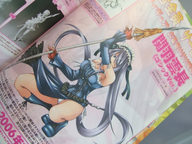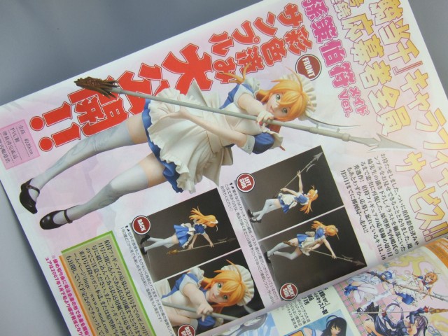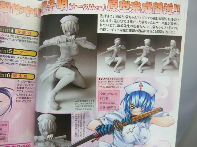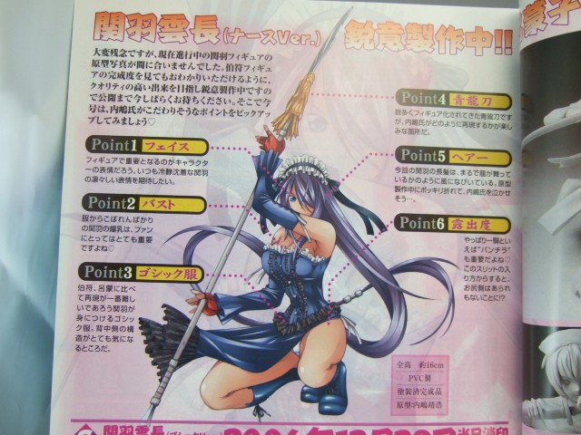 11月号まで3号連続全プレとなっていた、一騎当千フィギュアぼ「孫策伯符メイドVar.」(今月号の用紙では申し込み不可。10月31日締め切り)の彩色サンプルや、「呂蒙子明 ナースVer.」の無彩色原型サンプル、「関羽雲長 ゴシックVer.」(紙面はナースとなっていますが、先月号見る限り多分誤植)のポイント紹介などが掲載されていました。