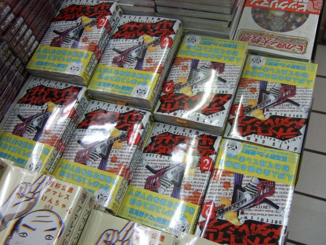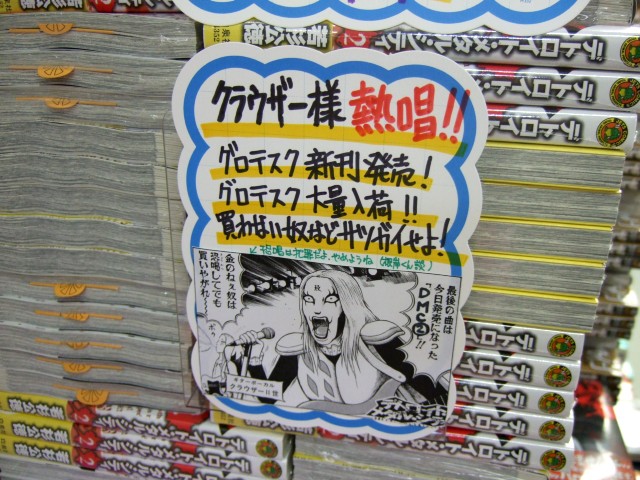 メロンブックスのPOPでは、「クラウザー様熱唱!!グロテスク新刊発売!グロテスク大量入荷!!買わない奴などサツガイせよ!」とされていて、いつもの様に鬼積みされ、2巻の表紙のクラウザー様のイラストをおおきく展示していました。