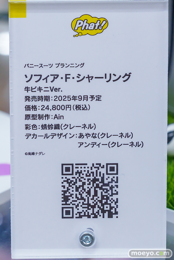 ファット・カンパニーの新作美少女フィギュア「バニースーツ プランニング ソフィア・F・シャーリング 牛ビキニVer.」の彩色サンプルが、あみあみ 秋葉原ラジオ会館店で展示!『イラストレーター高峰ナダレ氏が展開するオリジナルシリーズ『バニースーツ プランニング』より「ソフィア・F・シャーリング」が1/6スケールフィギュア化です。ボディラインが強調された大胆かつ魅力的な牛柄ビキニ姿で立体化致しました。肉感的な造形や戸惑いつつも微笑む表情、牛柄ビキニと肌の質感との美しい対比など彼女の愛らしさとセクシーさを忠実に再現しています。』というもので、原型制作はAinさん。彩色は蜻蛉織(クレーネル)さん。その展示の様子を画像レビューとしてお伝えします!