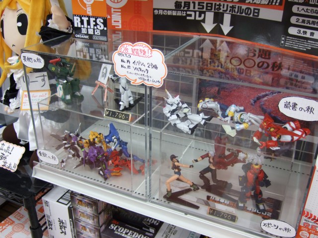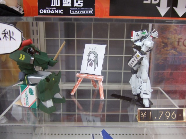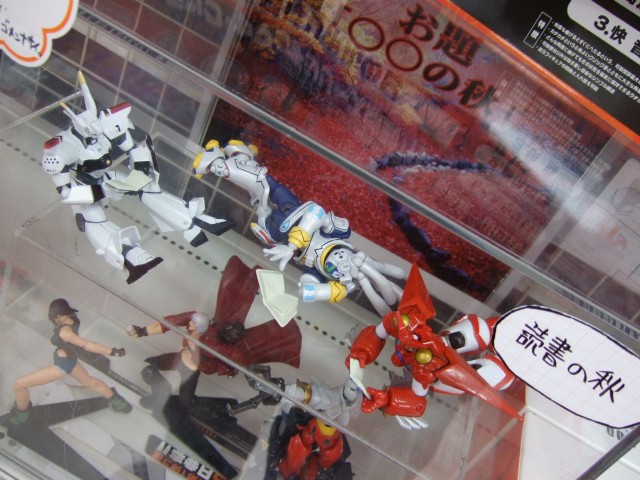 以前、ロケ地 ナメック星や、祝!日本ハム25年ぶりパ・リーグ制覇!もあったとらのあな本店では、11月15日発売予定の、海洋堂のリボルテック第7弾「No.14 イングラム2号機」(AA)と「No.15 ソルティック」(AA)のサンプル展示がされています。今回は「〜の秋」をテーマに展示されていて、「ソルティック」(AA)が「イングラム2号機」(AA)をモデルに描いていたのは、ちゅるやさんw