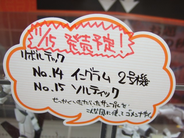 POPには「No.14 イングラム2号機」(AA)と「No.15 ソルティック」(AA)の発売告知と共に、「せっかくいただいたサンプルを、こんな風に使ってゴメンナサイ。」ともw