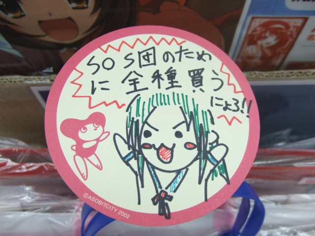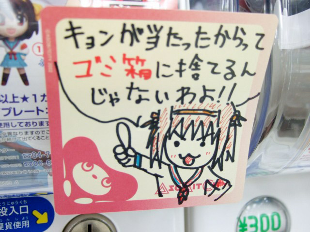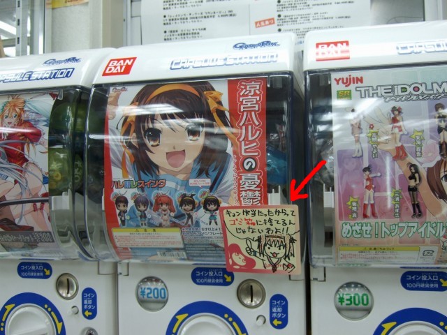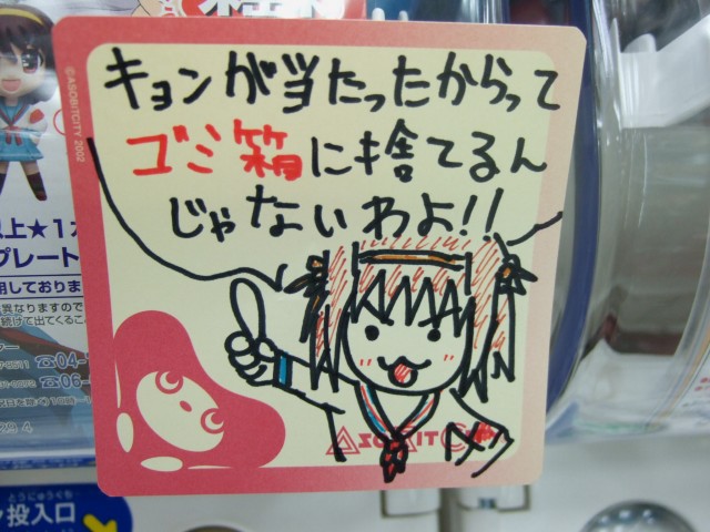 アキバでは10月25日ころから発売されているバンダイ「涼宮ハルヒの憂鬱 ハレ晴れスイング」ですが、サンプル展示もあったキャラシティ5Fのガチャに、ちゅるやさん化されたハルヒのイラスト付のPOPで「キョンが当たったからってゴミ箱に捨てるんじゃないわよ!!」というものがあることに気がつきました。店員さんに伺ったところ、どうやら本当に捨ててあったみたい。