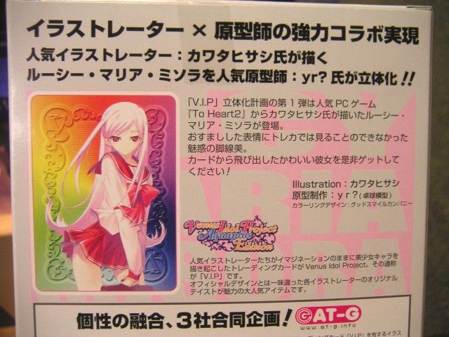 グッスマの商品説明によると「人気イラストレーターたちが美少女キャラを自由に描き起こし、その集合体をトレーディングカード化したもの、それが「V.I.P」(VENUS IDOL PROJECT)。その人気V.I.Pを企画集団「AT-G」が立体化。オフィシャルデザインとは一味違った人気作家のオリジナルテイスト、その魅力をあますところなくお届けしようという、ファン垂涎のコラボレーションがスタートしました!!第1弾は人気PCゲーム『To Heart2』からカワタヒサシ氏が描いたルーシー・マリア・ミソラが登場。おすましした表情に、トレカでは見ることのできなかった魅惑の脚線美。平面から飛び出したかわいい彼女を是非ゲットしてください!」というもの。