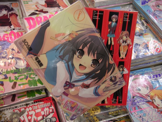 涼宮ハルヒ3大付録として、 いとうのいぢ氏描き下ろし下敷き、ザ・スニ特製しおりセット、「ドラ☆スタF」ザ・スニ限定カードがついてくるみたいで、下敷きとしおりのサンプルがゲーマーズ本店で展示されていました。