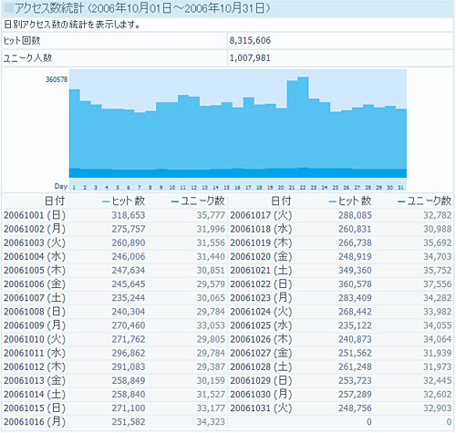 総ヒット数は831万5606。総ユニーク数は100万7981でした。トップページへのアクセス149万2293PV。(内、新環境トップは142万8980、旧ライブドアブログトップは6万3313)