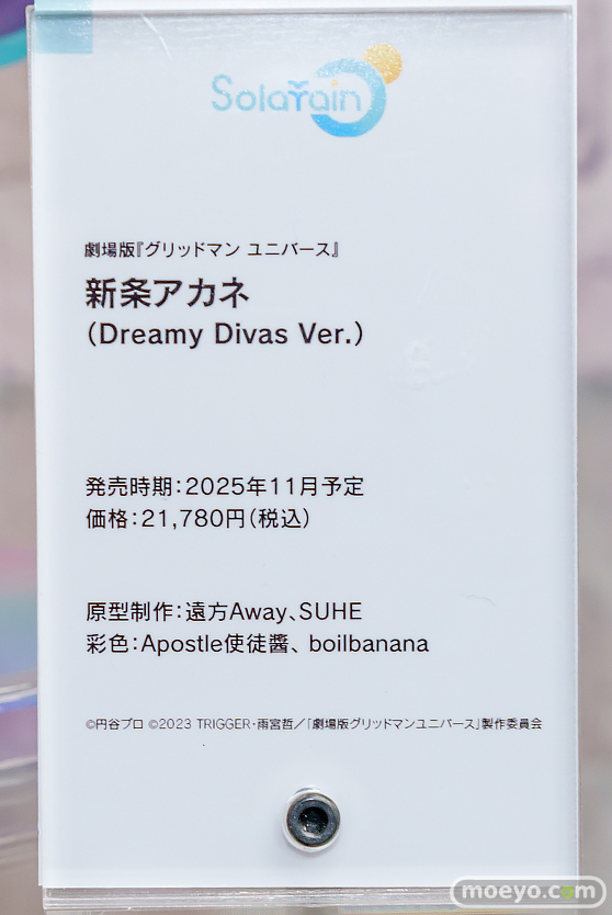 Solarainの新作美少女フィギュア「劇場版『グリッドマン ユニバース』新条アカネ(Dreamy Divas Ver.)」の彩色サンプルが、秋葉原のボークスホビー天国2で展示!『キャラクターデザインを担当する坂本勝氏による新規描き下ろしイラストをモチーフに、いつもの制服姿とは一味違う魅力が詰まったフィギュアとなっております!本編に登場するヘッドホンも忠実に再現したほか、オリジナル衣装には目を引く多彩なディテールが加えられています!』というもので、原型制作は遠方Awayさん、SUHEさん。彩色はboilbananaさん、Apostle使徒醤さん。その展示の様子を画像レビューとしてお伝えします!