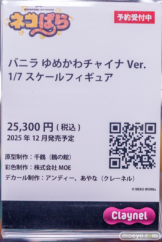 ■ 商品名:「バニラ ゆめかわチャイナVer.」 ■ 発売元:クレーネル ■ 仕様:PVC塗装済完成品 ■ サイズ:1/7スケール 全高約200mm(台座含む) ■ 原型制作:千鶴(鶴の館) ■ 彩色:株式会社MOE ■ デカール:アンディー、あやな(クレーネル) ■ 価格:税込25,300円 ■ 発売:2025年12月 |