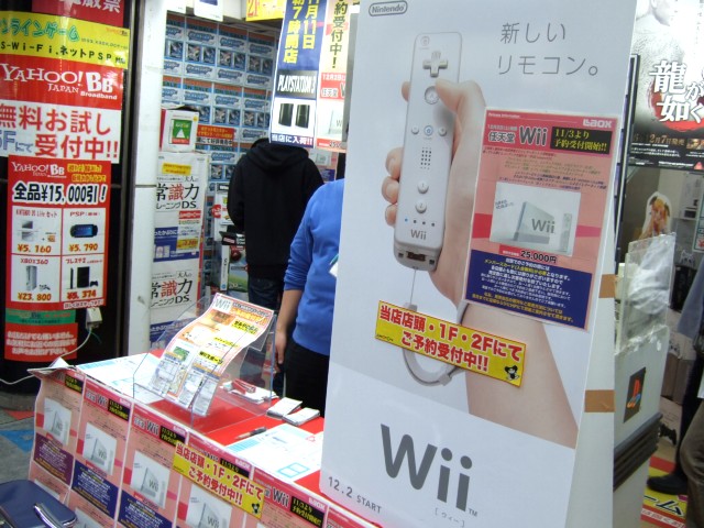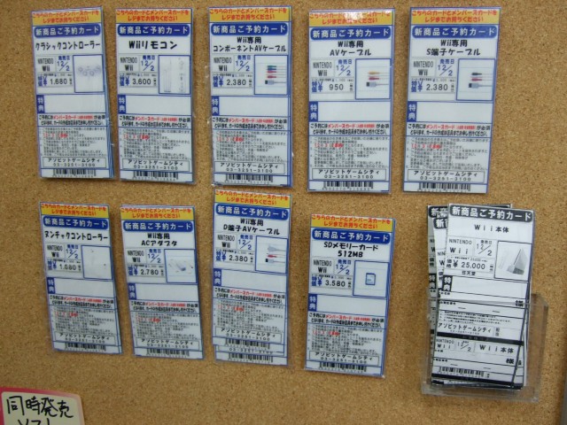 アキバで「Wii」予約受付を開始したのはゲームシティ、ホビーシティ2店舗のみで、ソフマップ本店は、「Wii」の展開はあったものの、予約などの告知はなし。石丸ゲームワンでは予約受付の予定無し。ヨドバシakibaでも店員さんに伺ったところ、予約受付の予定はないみたいです。