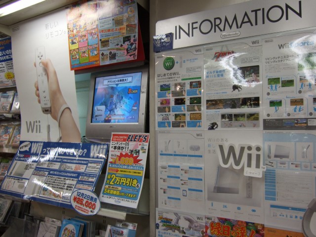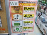 店内には「Wii」のPOPが展開されていて、それによると『豆電球1個程度の低消費電力でインターネットと常時接続し、眠っている間にもコンテンツを届ける「wiiConnnect24」』『ファミコン、スーファミ、ニンテンドウ64、メガドライブ(セガ)、PCエンジン(NEC・ハドソン)のゲームソフトをインターネット経由でダウンロード(有償)しプレイ可能な「バーチャコンソール」』「ニンテンドーDSとの無線通信の他、無線LAN(IEEE802.11b/g準拠)またはUSB-Ether変換コネクタ(オプション)によるインターネット接続」『全く新しいインターフェース「Wii リモコン」の直感的操作』などが特徴そして挙げられています。(本体スペックこちら)