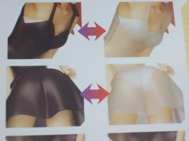 これによると、常温(30度以下)では、黒ドレスに黒ストッキングで、このドレスやストッキング部分を、指で触るなどして、30度以上に暖めると、カラーが変化(透けてくる)し、一度透けさせると、16度以下で冷やすまではまで、そのまま透けた状態をキープ。で、冷蔵庫などで、16度以下に冷やすとまたもとの黒ドレスに黒ストッキングに戻るという、「メモリー機能」を搭載した「温感インク・メタモカラー」塗料というものを使用したものみたいです。
