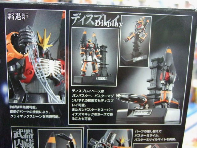 バスターマシン1号、2号からガンバスターへの変形合体を再現。バスターコレダー展開可能。胸部装甲着脱可能。縮退炉パーツ、バスタートマホーク、バスターホームラン、バスターシールド他各種武器。マシーン兵器RX-7<ジゼル>などが付属。