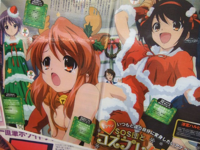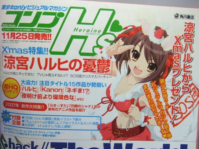 ほか、本誌の広告欄によると、11月25日発売予定の「コンプH’s 第2弾」でもハルヒ特集「SOS団クリスマスパーティー」とされていて、谷間の見えるサンタハルヒイラストが掲載されていました。「ちょっとH’sな福袋」とやらもあるみたいですよ奥さん!w