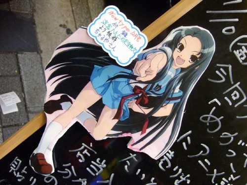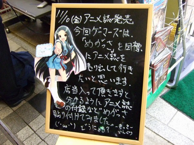 ゲーマーズ本店の立て看板では、「ニュータイプ 12月号」(AA)の本誌同寸特別大付録「涼宮ハルヒの完全無欠」に収録されている鶴屋さんの全身図を切り抜いて掲示していて、それによると『11/10(金)アニメ誌発売 今回ゲーマーズは「めがっさ」を目標にアニメ誌を売り出して行きたいと思います。店当入って頂きますと分かるようにアニメ誌の付録などめがっさ貼り付けてみました。(´・ω・`)どうにょろ?』とされていました。