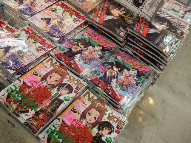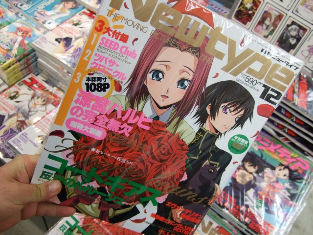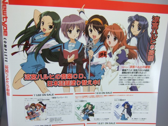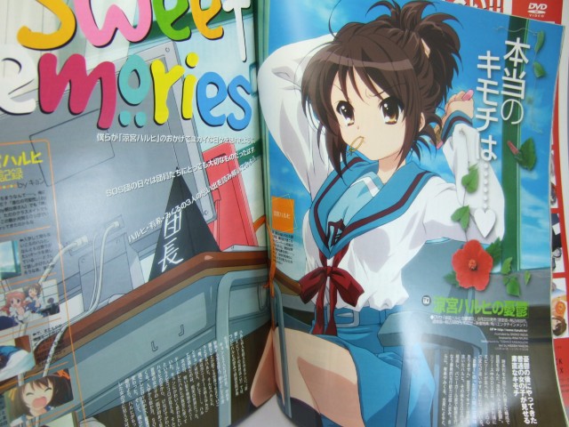 11月10日、「ニュータイプ 12月号」(AA)、「アニメディア 12月号」(AA)、「アニメージュ 12月号」(AA)と、毎月恒例のアニメ専門誌3誌の最新号が同時発売されていました。ゲーマーズ本店では『今回ゲーマーズは「めがっさ」を目標にアニメ誌を売り出して行きたいと思います。』として、3誌の付録などを「めがっさ貼り付け」していました。画像はその中のアニメディア記事抜粋のハルヒ。