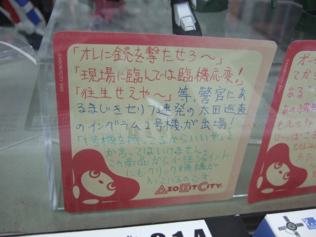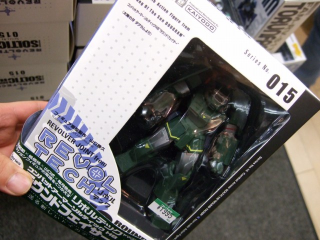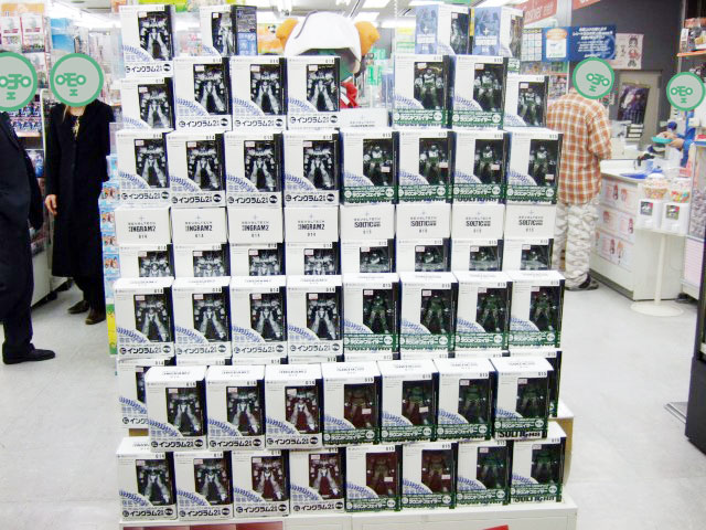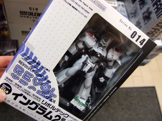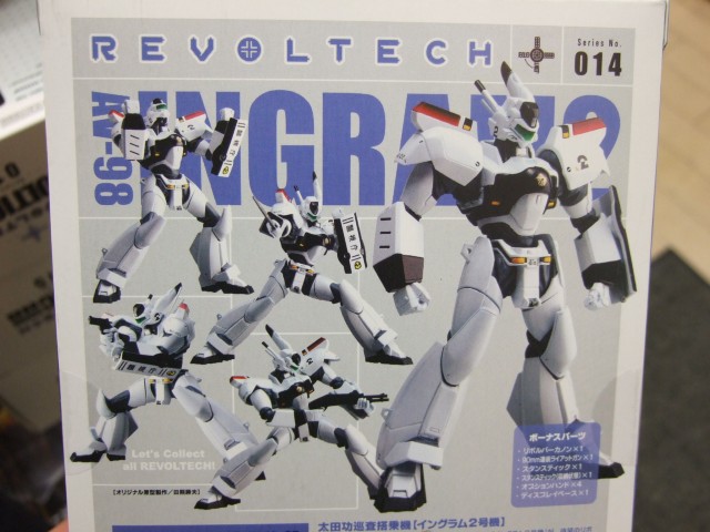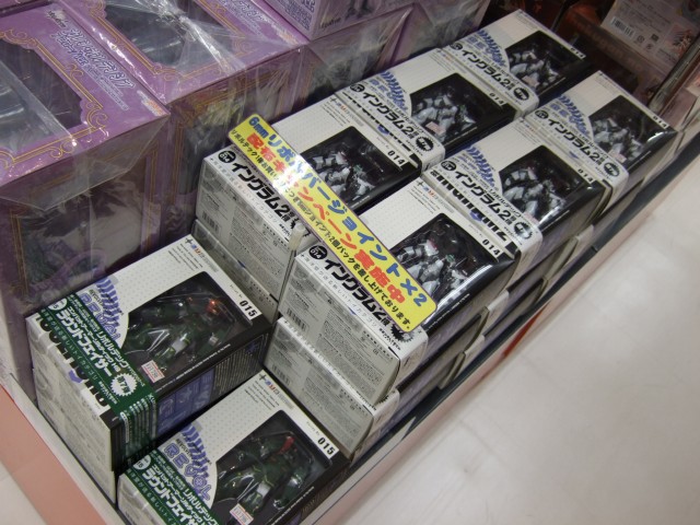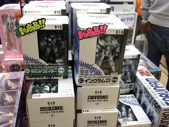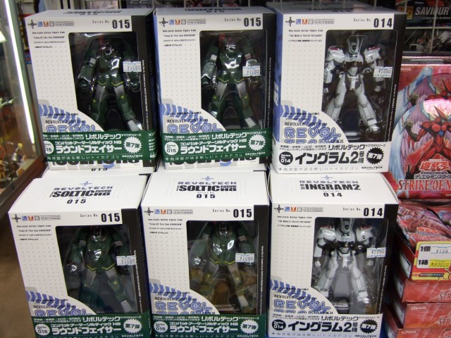 11月15日、とらのあな本店で、せっかくいただいたサンプルを、こんな風に使ってゴメンナサイ。というサンプル展示もされていた、海洋堂のリボルテックシリーズ第7弾「No.014 イングラム2号機 」(AM)と「No.015 ソルティック」(AM)の2種がアキバで発売されていました。
