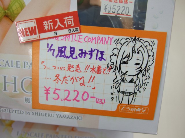 11月17日、グッスマ「おねがいティーチャー 風見みずほ」(AA)がアキバで発売されていました。これは、WHF有明14のグッスマブースで展示されていた、「おねがいティーチャー」の主人公「風見みずほ」を水着姿で立体化したもので、発表当初2006年夏発売予定が延期されていたもの。とらのヘタレPOPでは、「つ・・・ついに発売!!水着で!!・・・冬だがな!!」と書かれていました。