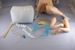 左は付属パーツ一覧。服パーツキャストオフ後に支えとなる枕、キャストオフ後に取り付ける両腕、式神2種、お払い棒、勾玉ネックレス、予備のお札4枚が付属と、地味に付属品も充実。