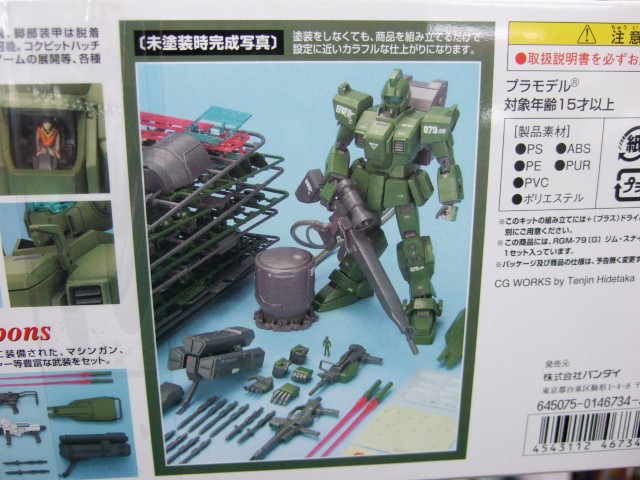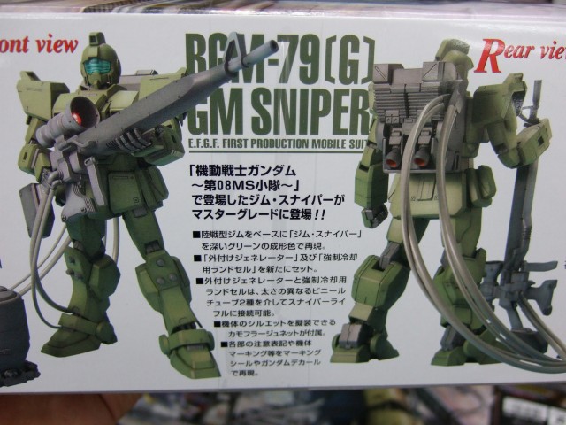 「1/100 MG ジム・スナイパー」(AM)のパッケ表。側面には機体解説や可動部位の解説、未塗装完成サンプル画像など。