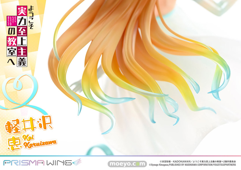 TVアニメ『ようこそ実力至上主義の教室へ』から、ヒロインのひとり「軽井沢恵」をベビードール姿でフィギュア化!クラス内ヒエラルキー最上位の華やかさ、触れれば壊れてしまいそうな繊細さ。彼女の魅力的な二面性を、いつもとは違う衣装で表現した1体です。可憐なプロポーションに映えるのは、PRISMA WINGオリジナルデザインのベビードール。上品なシアー感を伝えるクリアパーツに、ホワイトとブルーグリーンで陰影をつけ、柔らかな印象を生み出しました。明るく大きな青い瞳、透明感あふれるスキントーン、ポニーテールのグラデーションなど、各部の色彩・造形は作中を思わせる仕上がり。特製ベースのハートリボンも可愛らしさを演出します。【プライム1スタジオ】