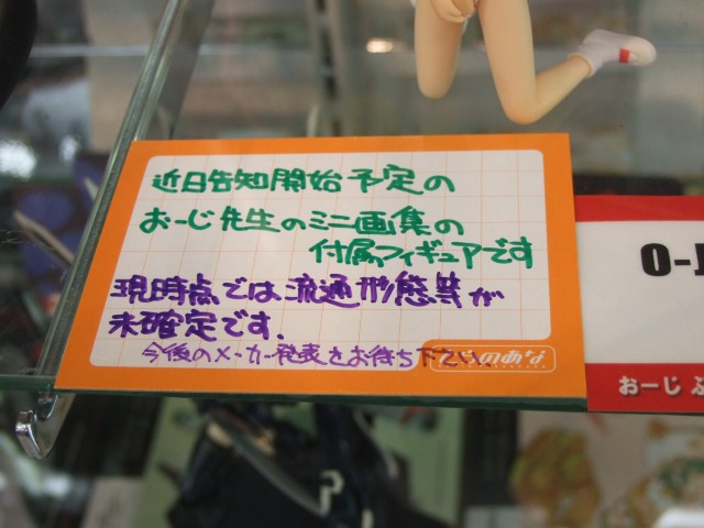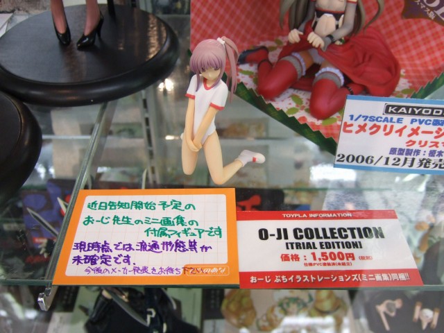 11月29日、とらのあな本店と、ソフマップ本店にて、トイプラblogで「はいてない ではなく はかせてない!! 」として紹介されていた、2007年春発売予定のトレーディングフィギュア「おーじコレクション(仮称)」のお試し版として、12月に発売予定の、フィギュア用に描き下ろされた全イラストを収録した本+フィギュア1体をセットにした「O-JI COLLECTION TRIALEDITION」付属フィギュアのサンプル展示が開始していました。