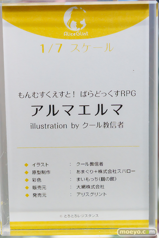 アリスグリントの新作美少女フィギュア「もんむす・くえすと! ぱらどっくすRPG 「アルマエルマ illustration by クール教信者」」の彩色サンプルがあみあみ 秋葉原ラジオ会館店で展示!『大人気ゲーム『もんむす・くえすと! ぱらどっくすRPG』より、アルマエルマが1/7スケールで登場!クール教信者先生のイラストを元に、立体化が実現しました。キュートなウインク顔と魅惑のセクシーボディのギャップを存分にご堪能ください♪』というもので、原型制作はあまぐりさん+株式会社スパローさん。彩色はまいもっち(鶴の館)さん。その展示の様子を画像レビューとしてお伝えします!