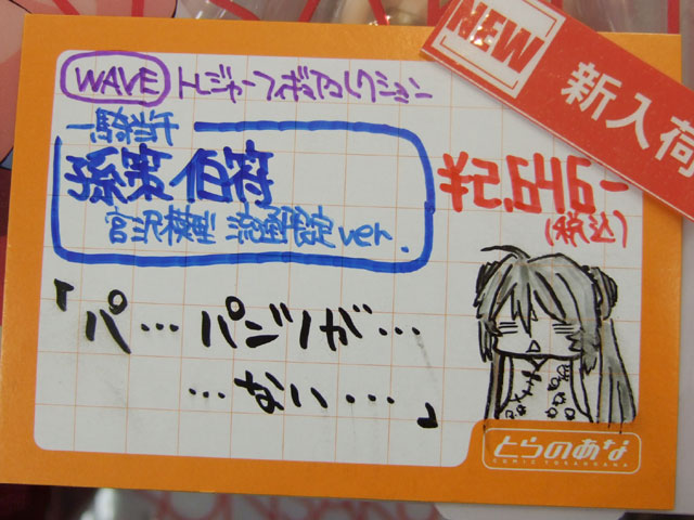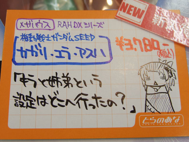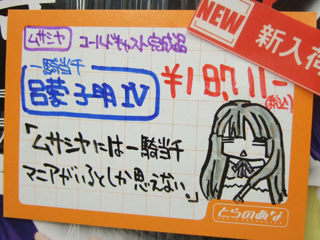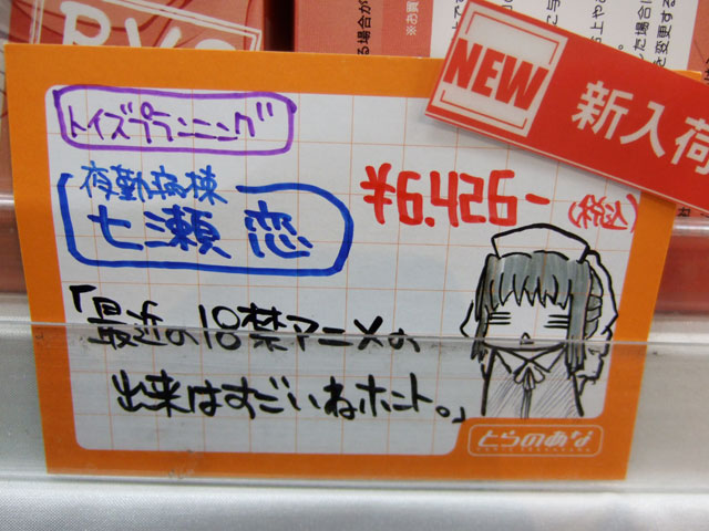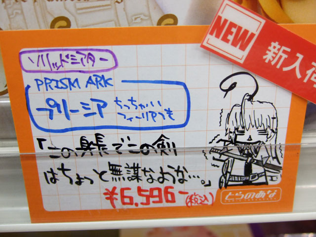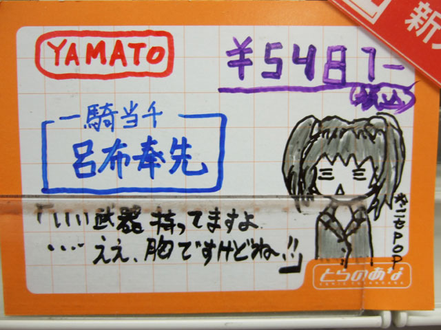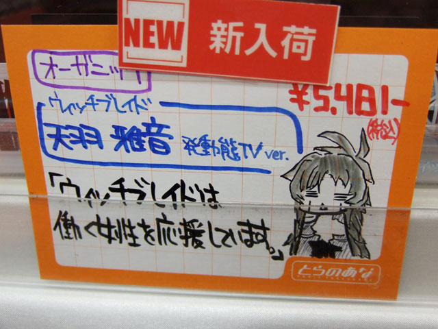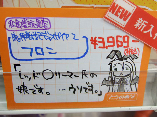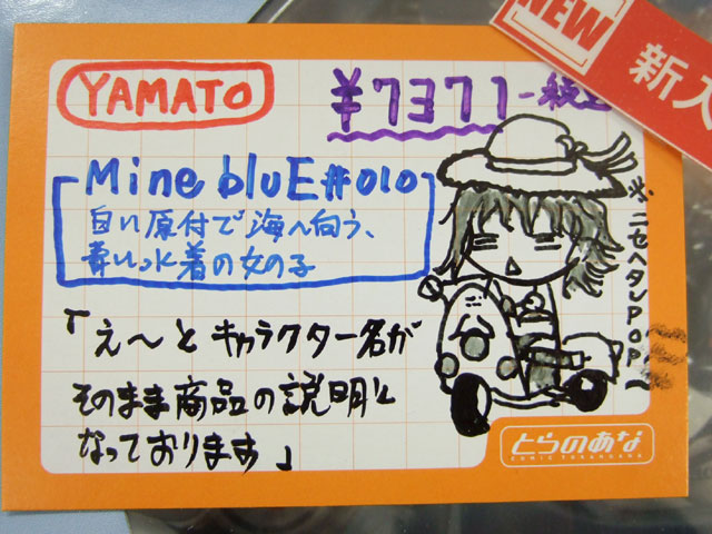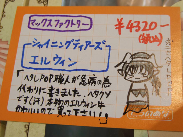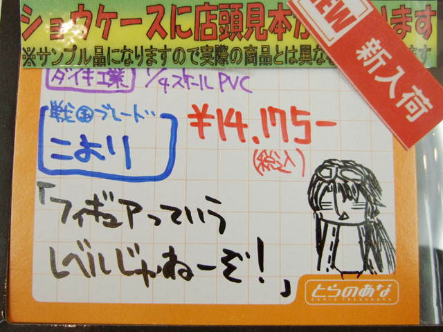 とらのあな本店5Fホビーコーナーの商品につけられている販促(?)用のヘタレPOPの11月14日〜12月1日に見かけたものをまとめてお伝えします。今回、ヘタレPOP職人の方が急病でダウンしてた時期があり、代理の方が描かれたニセヘタレPOPもありましたw 左の画像はダイキ工業「戦国ブレード こより 1/4」(AA)(参考レビュー)の「フィギュアってレベルじゃねーぞ!」