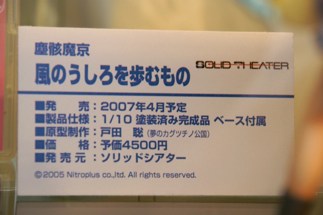 BFC東京2006で展示されていた、ソリッドシアター「塵骸魔京 風のうしろを歩むもの」のキャストサンプルのレビューです。これは、立て続けに発売され、とらのあな本店で「出すぎじゃね?」というヘタレPOPもあった「イグニス」と同じ「塵骸魔京」のキャラ「風のうしろを歩むもの」を、戸田聡氏が立体化したもの。もう言わなくてもわかりますよね?最大の見所は当然「ケツ」ですw