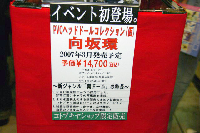 BFC東京2006で展示されていた、コトブキヤショップ限定「PVCヘッドドールコレクション 向坂環」のテストサンプルのレビューです。これは、会場で初お披露目となった、白髭創氏製作のPVC製ヘッドを採用し、新開発オビツ製素体に、コトブキヤ製巨乳柔らかパーツを使用したドール。制服のほか、スク水と縞ぱむ、黒のレースぱんちゅが付属してくるというこだわりの一品w