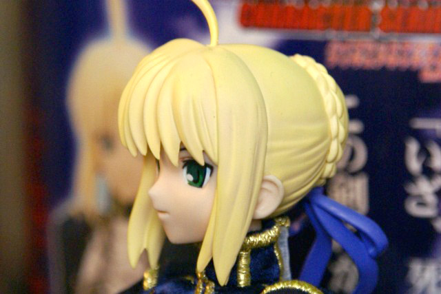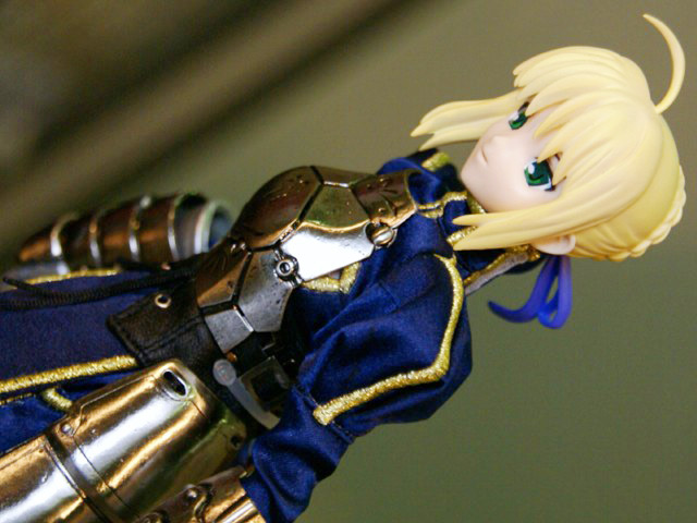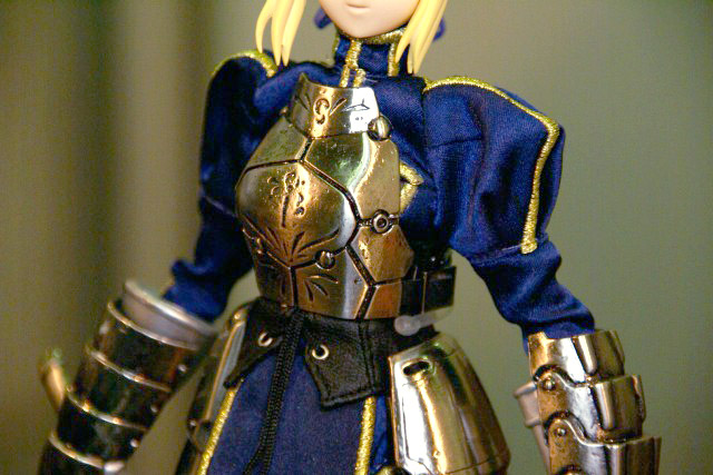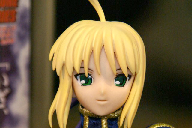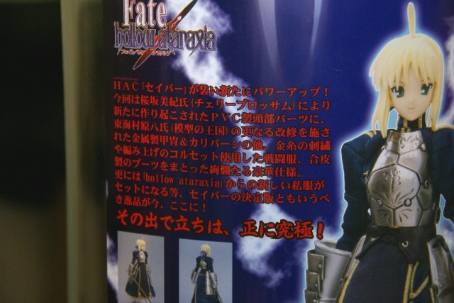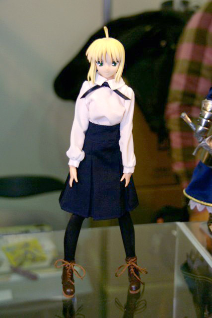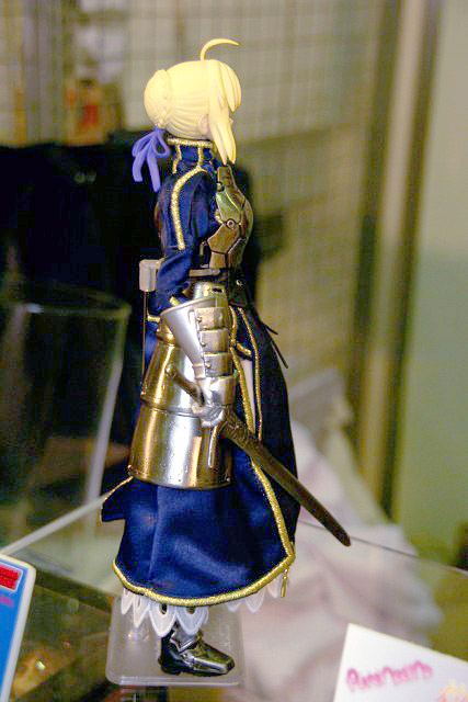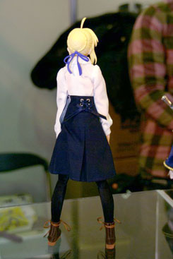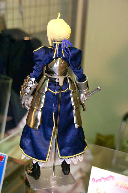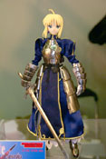 POPの解説によると『HAC「セイバー」が装い新たにパワーアップ!今回は桜坂美紀(チェリーブロッサム)氏により新たに作り起こされたPVC製頭部パーツに、東海村原八(模型の王国)氏の更なる改修を施された金属製甲冑&カリバーンの他、金糸の刺繍や編み上げのコルセット使用した戦闘服、合皮製のブーツをまとった絢爛たる豪華仕様。更にはhollowからの新しい私服がセットになる等、セイバーの決定版ともいうべき逸品が今、ここに!その出で立ちは、正に究極!』とされているもの。展示されていたのは甲冑を着たものでした。