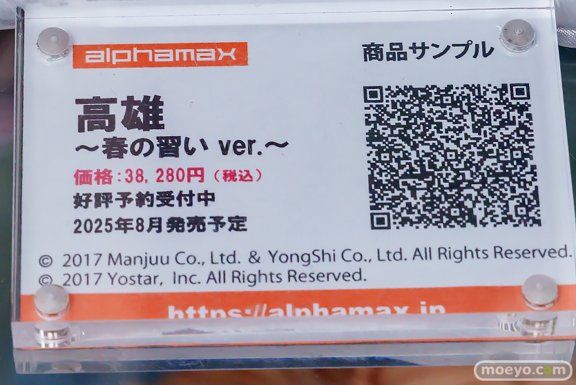 2025年8月発売予定のアルファマックス新作美少女フィギュア「アズールレーン 高雄 ~春の習い ver.~」の商品サンプルが、あみあみ 秋葉原ラジオ会館店で展示!『大人気ゲーム「アズールレーン」より、『高雄』が登場!妖艶なチャイナドレス姿を大迫力の1/4スケールで細部まで再現し、立体化しました。豊満なボディーを際立てる大胆な衣装にと後姿からも感じられる引き締まったボディーライン。こちらを意識しながらちらっと見つめる表情まで忠実に再現いたしました。傘が付属パーツとしてあり、世界観を演出するこだわりの仕様としております。』というもので、原型制作はAXIAさん。彩色はLilanさん。その展示の様子を画像レビューとしてお伝えします!