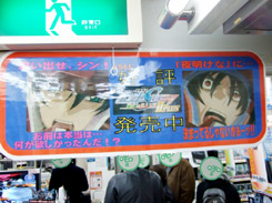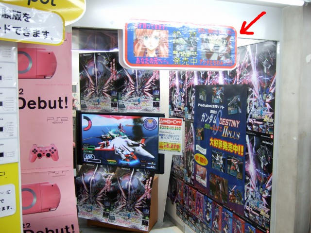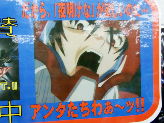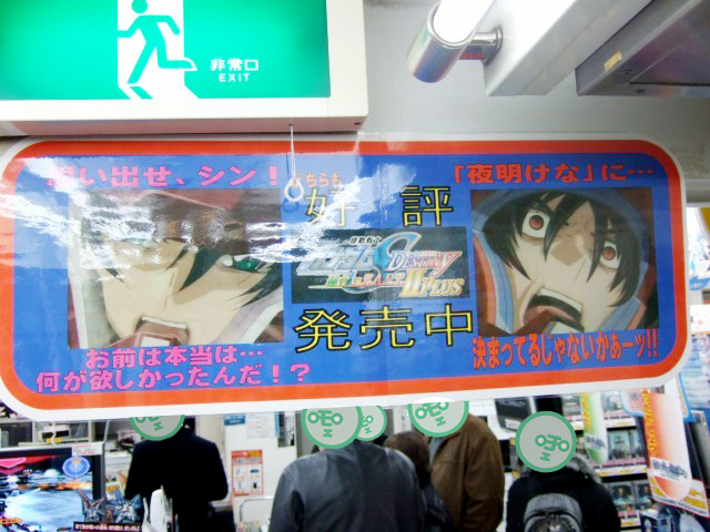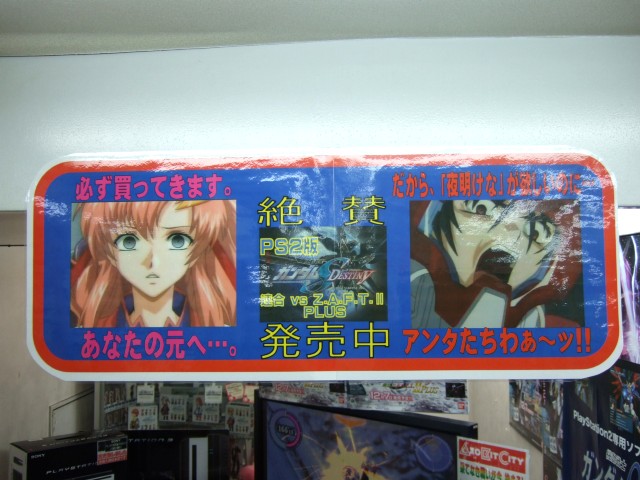 12月7日、PS2「機動戦士ガンダムSEED DESTINY 連合vs.Z.A.F.T.II PLUS 」(AA)が発売し、ゲームシティではミーアのコスプレ店員さんが店頭販売していたり、2FのPS2ソフト売り場でもおおきく展開していましたが、個人的に一番目を引いたのは、エスカレーター上ったエントランス上部に貼り付けられた、シンが『「夜明けな」が欲しいのにアンタたちわぁ〜ッ!!』と叫んでいたPOPw
